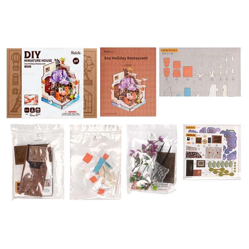 Յուրահատուկ Sea Holiday Restaurant roombox-կոնստրուկտորը հիշեցնում է ծավափնյա ռեստորան: Այն բազմաթիվ հետաքրքիր դետալներով մանրակերտ է, որը ստեղծում է ջերմ մթնոլորտ: Հավաքածուն հագեցած է բոլոր նյութերով և գործիքներով, որոնք անհրաժեշտ են դեկորատիվ դետալների, սպասքի և կահույքի վերստեղծման համար։