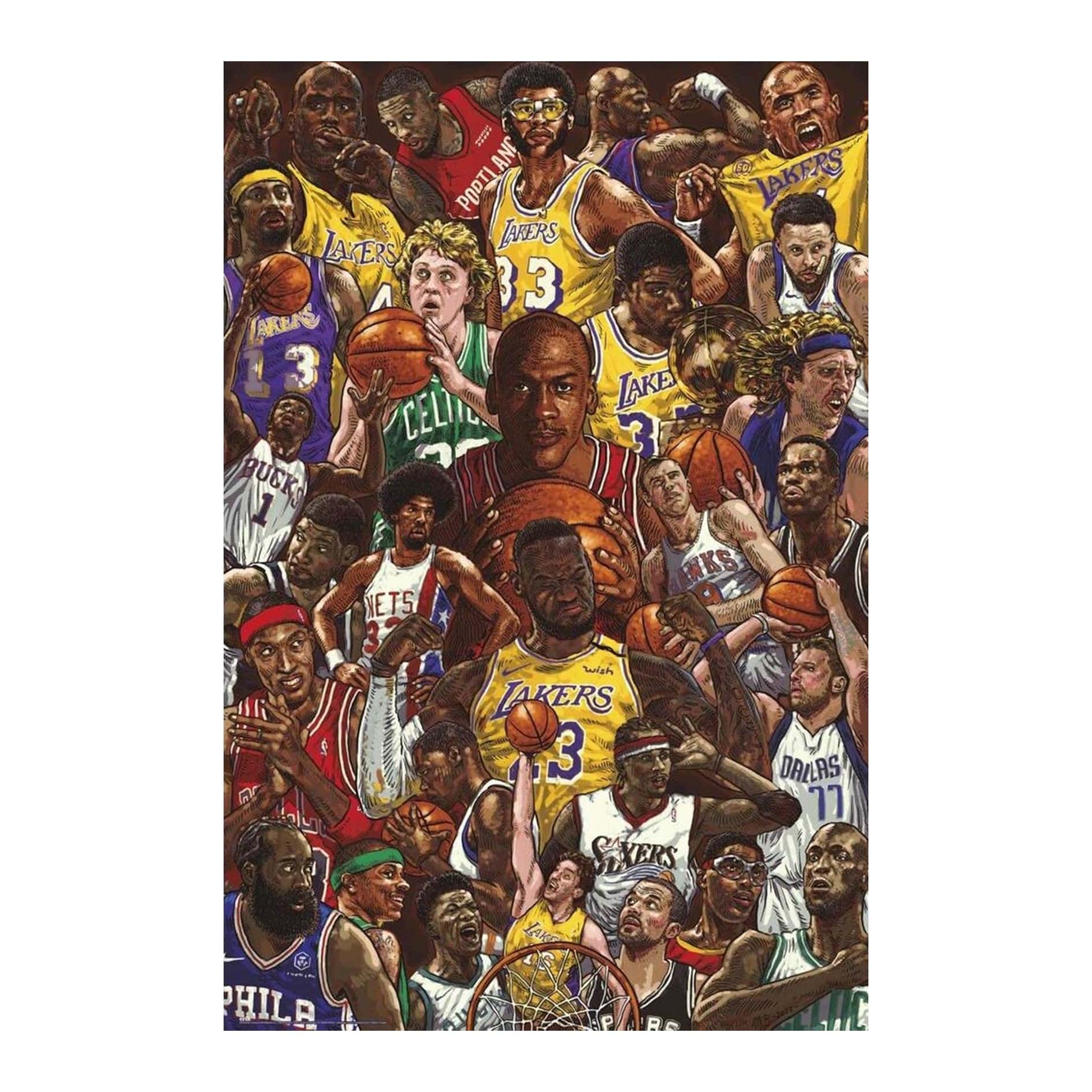 Այս պաստառը ներկայացնում է բասկետբոլի պատմության ամենանշանակալի և ճանաչված մարզիկների համադրությունը՝ մեկ հզոր և դինամիկ կոմպոզիցիայի մեջ։ Տարբեր սերունդների աստղեր, տարբեր թիմերի գույներ և խաղային ոճեր միավորվում են՝ ստեղծելով բասկետբոլի իրական էպոսի տեսողական արտահայտություն։