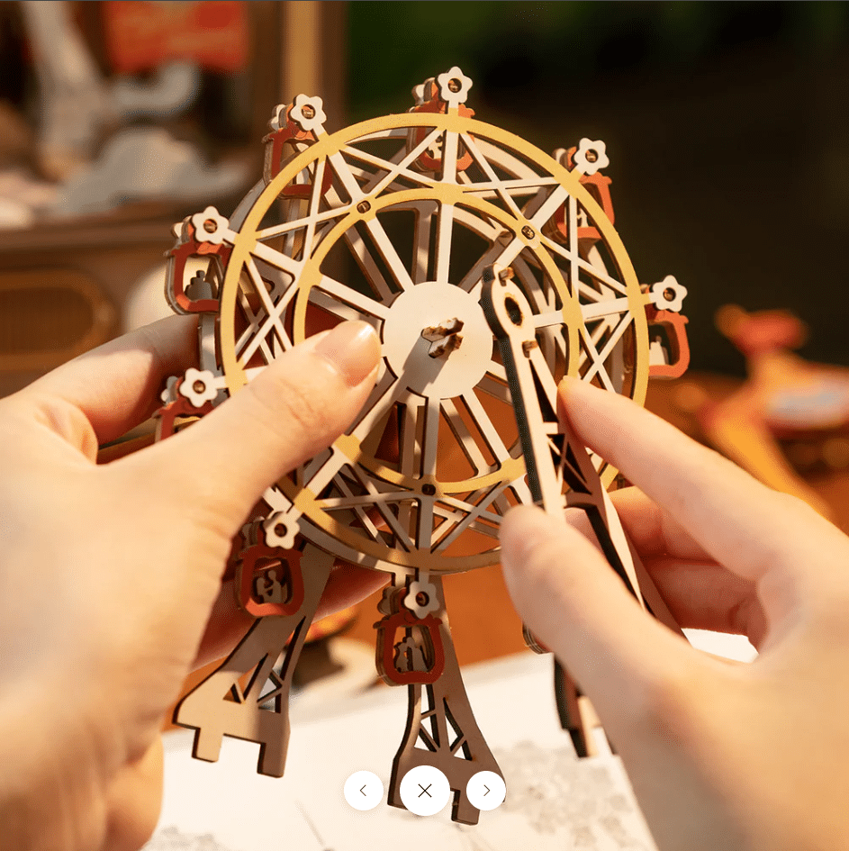 Այս տպավորիչ book nook-ի մեջ թաքնված են բազմաթիվ զարմանալի դետալներ։ Պտտվող ֆերիսի անիվի վրա կտեսնեք փոքրիկ կերպարներ տարբեր խցիկներում։ Գեղեցիկ արջուկը միանիվ հեծանիվով պտտվում է ծաղրածուի շուրջ։ Լույսը միացնելիս այն ստեղծում է իրական մայրամուտի տպավորություն՝ երկու կողմերում ձևավորելով գեղեցիկ ստվերային պատկերներ։Թարմացված այս 3D փայտե փազլը հնարավորություն է տալիս առանձին կարգավորել լույսն ու երաժշտությունը․ ձախ կոճակը՝ լույսի համար, աջը՝ երաժշտության և պտտման։ Բարձր որակի ձայնը ստեղծում է հաճելի մթնոլորտ։ Կարող եք ընտրել ցանկացած ռեժիմ՝ լուռ book nook կամ գիշերային լամպ։